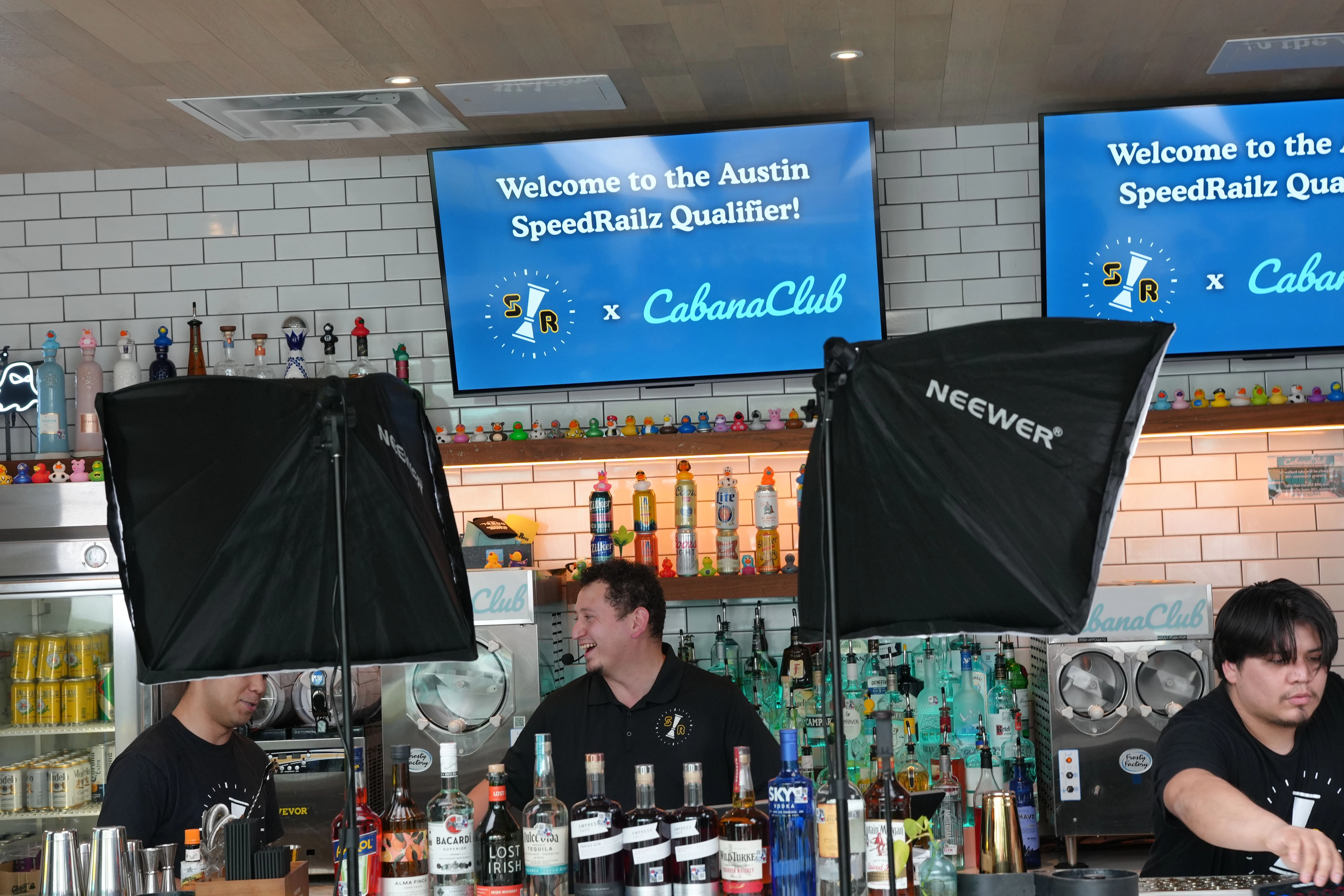 Railz on Rainey uses the SpeedRailz Relay format, a team-based bartending competition built around speed, teamwork, and execution.